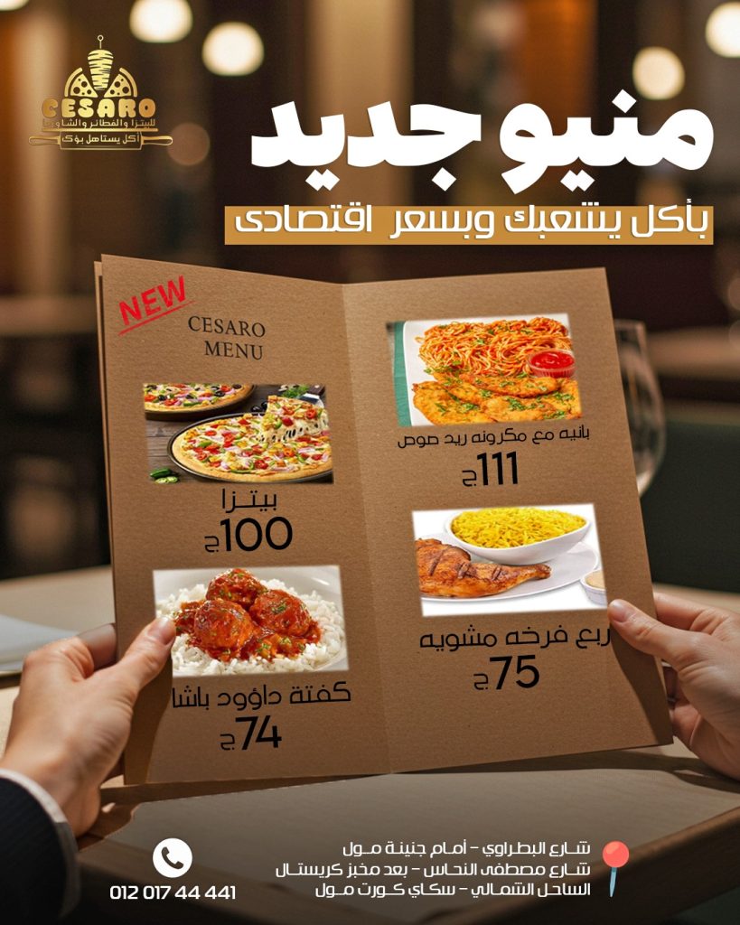 تقدم مطاعم سيزارو بفروعها الثلاثة مزيجا فريدا من الاطعمة المصرية المتمثلة في الفطير بكل أنواعه والاطعمة الشامية المتمثلة في الشاورما والبروست والاطعمة الايطالية المتمثلة في البيتزا الايطالية والامريكية وكذلك نقدم كافة المشويات